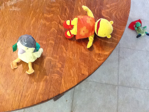 I see Elmo and Zoe together all the time, but since when have they started hanging out with Flamingo? I bet Elephant is sitting in the toy bin feeling left out. I wonder if they notice Shrek stealing their dinner or if they are too afraid to say anything.